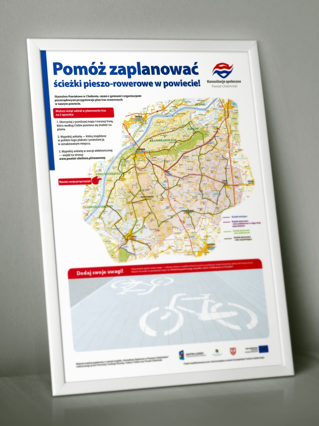 Już niedługo mieszkańcy będą mogli zaproponować swoje rozwiązania w jeszcze jeden sposób. Na terenie powiatu, m.in.: w szkołach, urzędach, oddziałach poczty, sklepach rowerowych – rozmieszczone zostaną specjalne plakaty, na których będzie można własnoręcznie dodać komentarz, a nawet wyznaczyć alternatywną wersję trasy.